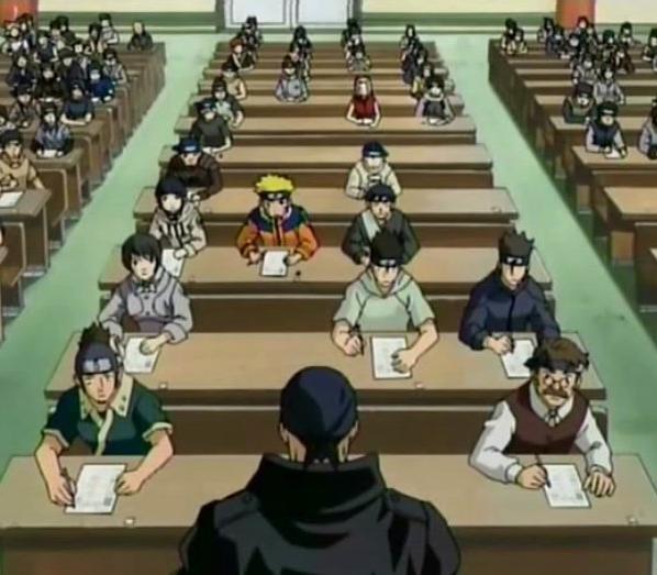 Um teste escrito que consiste em 10 perguntas. O controlador desta etapa do Exame é Morino Ibiki, o qual é tido como um maníaco. Por causa das suas habilidades para tortura, ele conhece a mente humana, suas fraquezas e como intimidá-las. Com isso, ele tenta fazer com que os genins que querem virar chuunins desistam da primeira fase do Exame Chuunin, onde ele é examinador. Seus exames são diferentes de quaisquer outros, como por exemplo o teste escrito que foi feito para Naruto e os outros. Ibiki posiciona em ambos os lados da sala vários examinadores e diz ser terminantemente proibido copiar. O problema é que as perguntas do teste são difíceis, algo que um genin não conseguiria responder. O exame escrito serve na verdade para as habilidades de copiar informações sem ser percebido. No principio é dito que quem tirar negativa na prova nâo poderá passar. No entanto é lançado uma décima questão. Quem acertar, passa para o próximo exame, e quem errar, nunca mais poderá participar num Exame Chuunin, mas existe a possibilidade da pessoa desistir e tentar no próximo ano sem precisar responder a esta questão. A lógica final do exame é: Quem permanecer, passa ao próximo nível. Quem desistir, não passa.